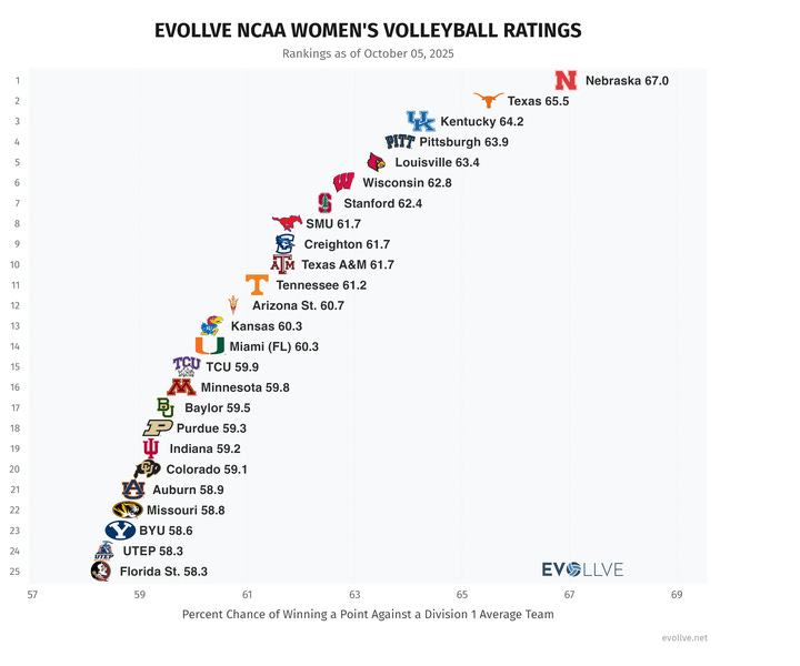 We’ll wrap things up with our model’s top 25 heading into the new week. Nebraska continues to distance itself from the pack, although Texas remains unbeaten as well. Kentucky surges up to the third spot thanks to a 14-set win streak over Evollve top-75 opponents.