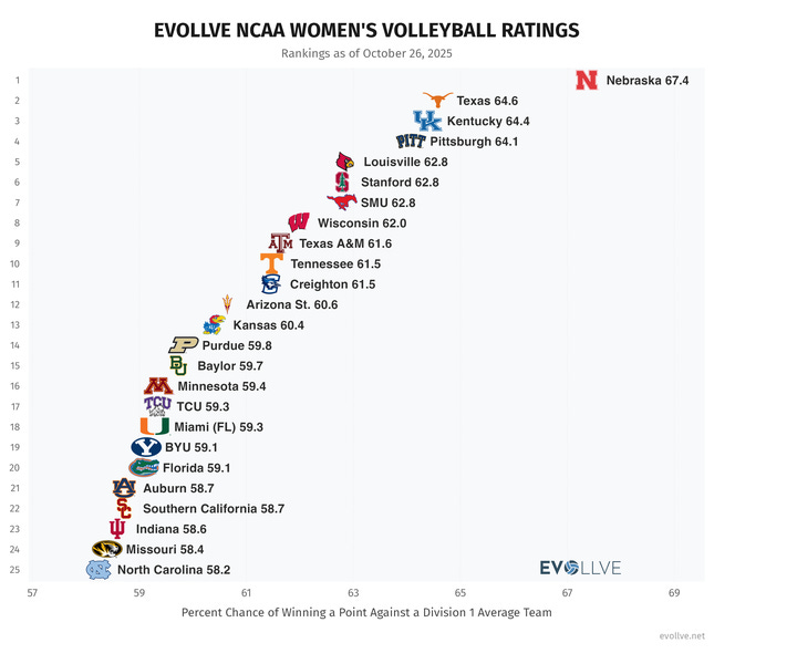 We’ll wrap things up with our model’s top 25 heading into the new week. As Nebraska continues to sweep everyone in their path, they continue to distance themselves from the pack in the rankings.